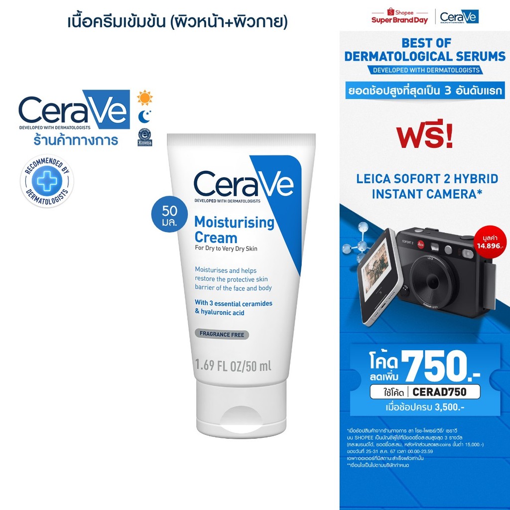 CERAVE Moisturising Cream 50g เป็นครีมบำรุงผิวหน้าและผิวกายที่ถูกพัฒนามาโดยเฉพาะสำหรับผิวแห้งและผิวที่มีแนวโน้มจะแห้งมาก ตัวครีมอุดมไปด้วยเซราไมด์ที่จำเป็นสำหรับการฟื้นฟูและเสริมสร้างปราการผิว พร้อมให้ความชุ่มชื้นอย่างล้ำลึกและยาวนาน ด้วยส่วนผสมของไฮยาลูโรนิคแอซิด ช่วยกักเก็บความชุ่มชื้นไว้ในผิว ลดปัญหาผิวแห้งและลอกเป็นขุยได้อย่างมีประสิทธิภาพ เนื้อครีมมีความเข้มข้นแต่ไม่เหนียวเหนอะหนะ ซึมซาบเร็วและสามารถใช้ได้ทั้งผิวหน้าและผิวกาย